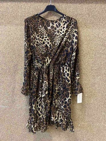 Ženska haljina/kaput-haljina sa printom Velicina 50 - Kroj: A-linija, dužina do ispod kolena; kratki rukavi. - Kopčanje: prednje kopčanje na dugmad. - Kragna: klasična, sa reverima. - Materijal: gl...