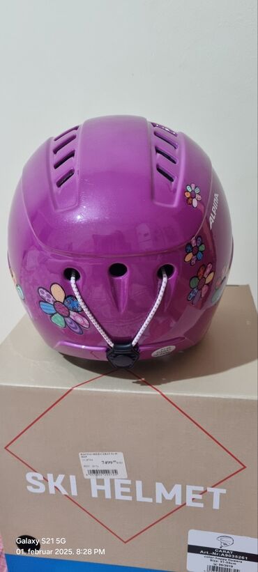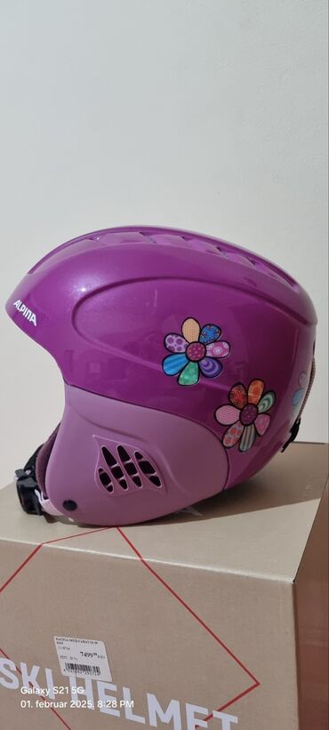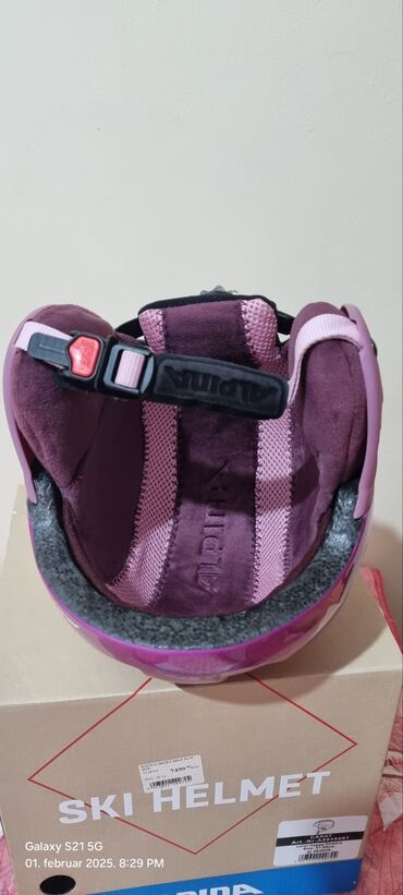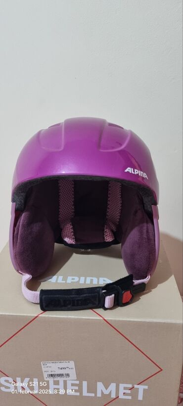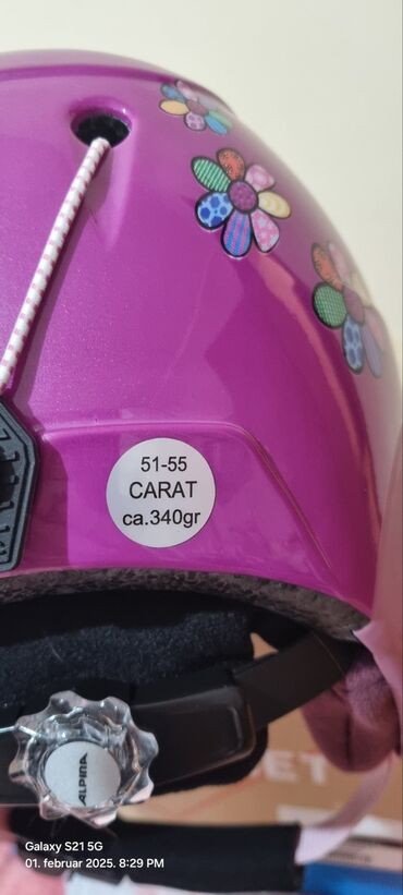 Alpina decija ski kaciga za devojcice dimenzije 51-55. Lagana 340gr. Malo nosena. Ima malo naprsnuce vidi se na slici pored levog uveta koje nema znacaja na udobnost i performanse kacige. U origina...