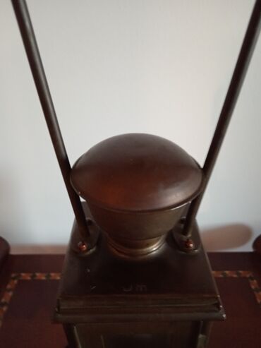 - Dimenzije: približno visina sa ručkom oko 35–45 cm (procena sa fotografija), telo lampe oko 12–15 cm širine