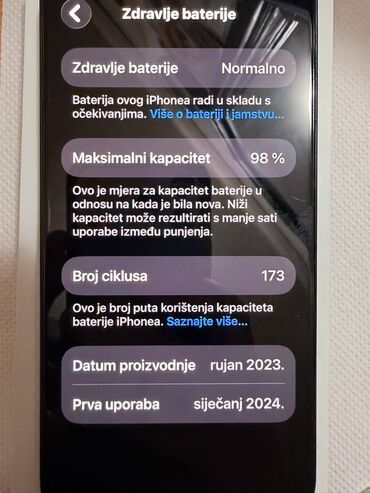 - Baterija: Zdravlje baterije prikazuje “Normalno”, maksimalni kapacitet 98%, broj ciklusa 173