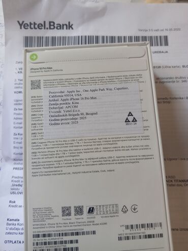 - Priložena dokumentacija: ugovor o namenskom kreditu za kupovinu uređaja (Yettel Bank), u kojem je naznačen artikal “APPLE IPHONE 16 PRO MAX 256GB BLACK TITANIUM (telefon)”