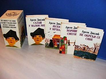 Arsen Diklić 1-4 , Romani Arsena Diklića , kompletNarodna knjiga Beograd 1978. tvrd povez, sa ilustr. pl. omotima, sa ilustr. kutijom, 207 strana, ilustracije, 21cm. knj.1: Ne okreći se sinetrilogija Salaš u malom rituknj.2: Salaš u Malom ritu (na preseku strana neznatna senka)knj.3: Jesen u mrtvajiknj.4: Moriški snegovi stanje Vrlo dobro .