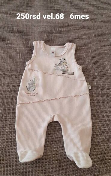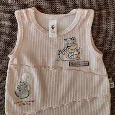 Dečiji bodi/majičica bez rukava za devojčice. Beli model sa šarenim printom “TIME” i sitnim motivima, ružičastim šavovima i ivicama. Jednodelni kroj, uži okrugli izrez i duboki izrez na leđima. Mat...