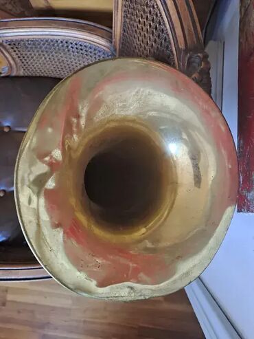 Truba, verovatno mesingani duvački instrument, prikazana je u tradicionalnom stilu. Ima zlatnu boju i sjajnu završnu obradu, što ukazuje na kvalitetan materijal. Instrument ima tri ventila, tipična...
