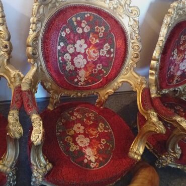 ŠarenoBarokne/rokoko stolice sa bogato rezbarenim ramovima u zlatnoj boji i raskošnom tapacirungom. Nasloni i sedalni delovi presvučeni su crvenim štofom sa goblen-vezom floralnog motiva (beli, ružičasti i narandžasti cvetovi sa zelenim listovima). Okrugli/ovalni nasloni sa dekorativnim ramom, ukrasne krivine na nogarama i rukonaslonima, reljefni ornamentni detalji. Drvena konstrukcija sa patiniranim zlatnim premazom, ručno rađeni ukrasi i aplikacije. Pogodne za dnevne i salonske prostore, foaje, urede, foto/filmske setove ili kao akcentni komadi u klasičnim enterijerima. Komadi formiraju komplet; sedišta i nasloni su podudarno dekorisani, sa izdašnim sunđer punjenjem za komforno sedenje. Elegantan, reprezentativan izgled sa vintage šarmom.