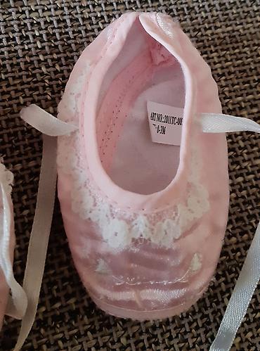 Bebi baletanke – roze, sa čipkanim detaljima i satenskim trakama za vezivanje. Mekane, lagane i udobne za novorođenče. Veličina: 0–3 meseca (označeno “0–3M” na etiketi). Idealne za posebne prilike ili fotografisanje.