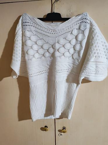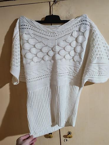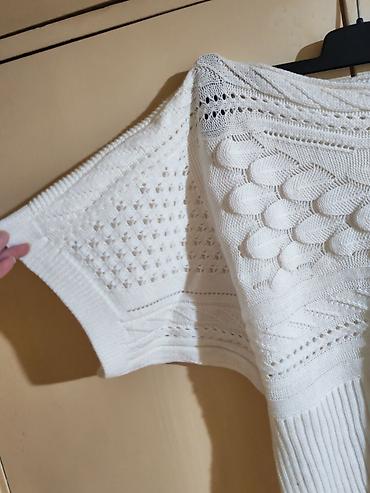 - Dizajn: kombinacija različitih pletenih tekstura – reljefne “mehurić” šare na prednjem delu, ažur uzorci i geometrijske pruge; V-izrez/širi čamac izrez