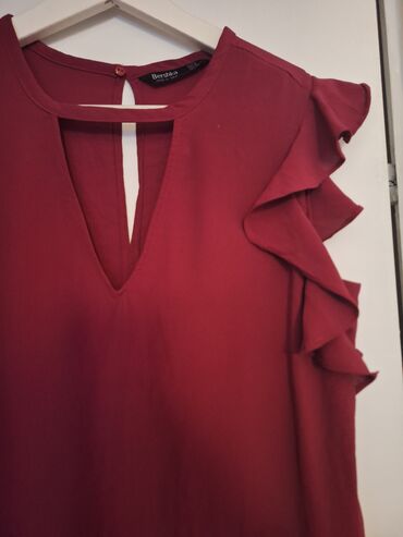 Ženska bluzica/majica sa dugim rukavima, u metalik zlatnoj boji. - Kroj: preklopni V-izrez sprijeda (wrap stil) sa blago skraćenom dužinom do struka. - Materijal: sjajna, plisirana/teksturirana tka...