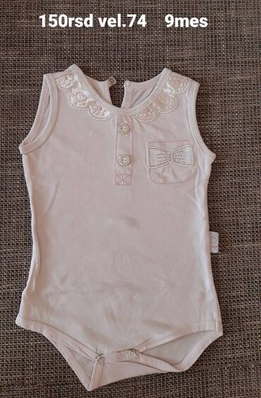 Nežni roze bodi za bebe devojčice, dizajniran bez rukava, idealan za tople dane. Karakteriše ga elegantna čipkana kragna i ukrasni dugmići na prednjoj strani. Na grudima se nalazi džep sa sjajnom mašnom, dodajući šarmantan detalj. Izrađen je od prijatnog materijala, pogodan za svakodnevno nošenje i obezbeđuje udobnost za bebu tokom celog dana.