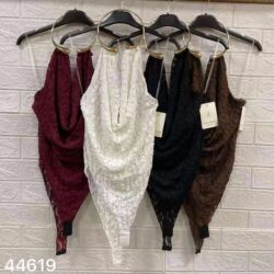 Beli ženski bodi dugih rukava sa dubokim V-izrezom sprijeda. Kopčanje na sitne dugmiće ide uzduž prednje strane, omogućava lako oblačenje i prilagođavanje dekoltea. Model je pripijen uz telo, sa el...