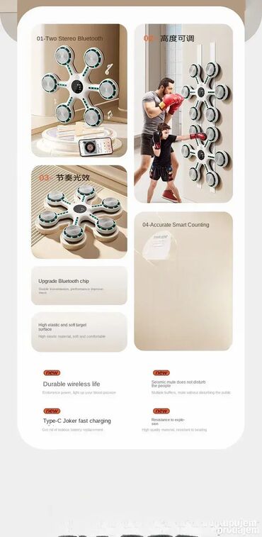Muzička tabla za boks i kik-boks savršen je dodatak za kućni trening. Namenjena je za poboljšanje refleksa, koordinacije pokreta i ritma kroz interaktivne svetlosne i zvučne signale.