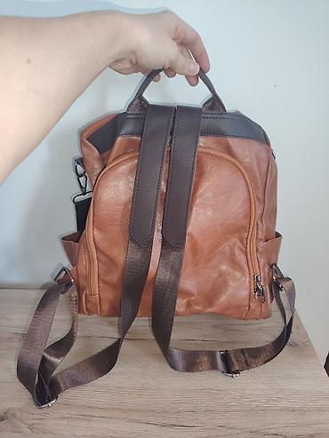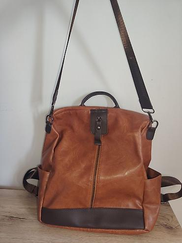 Torba/rančić od eko-kože, toplo braon boje sa tamno braon detaljima.