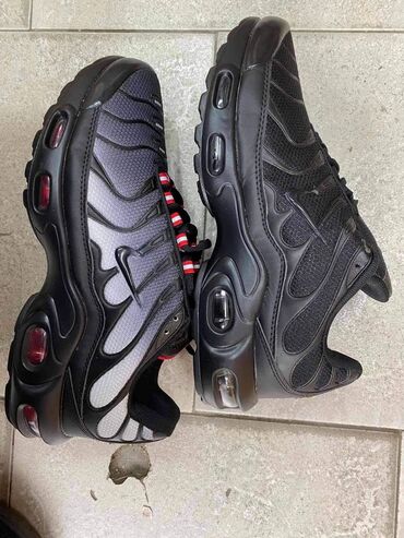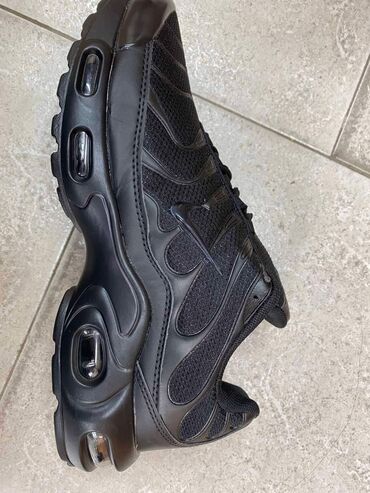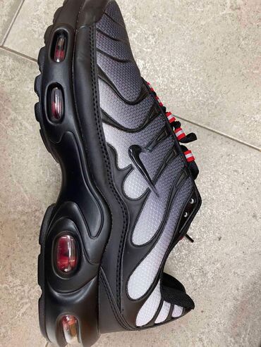 Nike Air Max patike - Model: Nike Air Max (oznaka sa etikete: DQ) - Veličina: US 9.5 / UK 8.5 / EU 43 / CM 27.5 - Boja: pretežno crna sa tamnosivim detaljima; crveni Nike logotip na jeziku i ulošk...