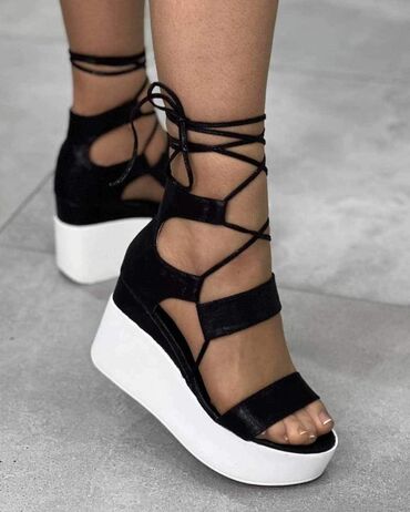 Crne ženske sandale na klina (platforma/wedge) sa vezivanjem oko članka i potkolenice. Gornjište od mekanog materijala sa izgledom brušene kože, otvoreni prsti i više poprečnih traka koje pružaju s...