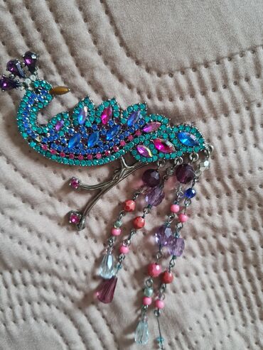 Metalna broš igla u obliku lista - Materijal: metal sa sjajnom, teksturisanom završnom obradom - Dizajn: stilizovan list sa jasno izraženim nervaturama; izduženi, zakrivljeni oblik - Mehanizam: ig...Bros, paun. Novo!