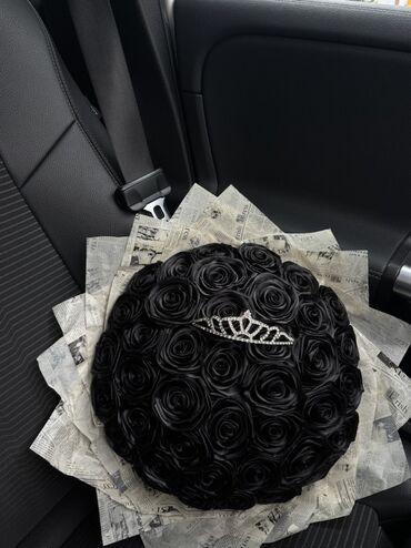 - Raskošan okrugli aranžman sastavljen od gustih crnih ruža izrađenih od satena, sa realističnim spiralnim laticama.