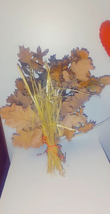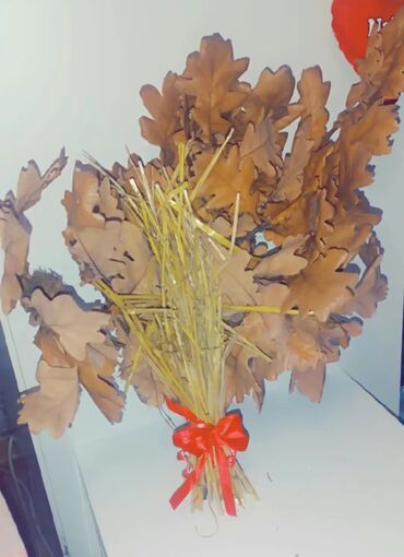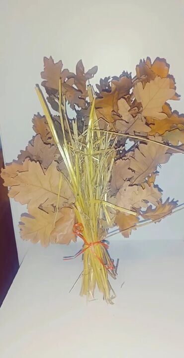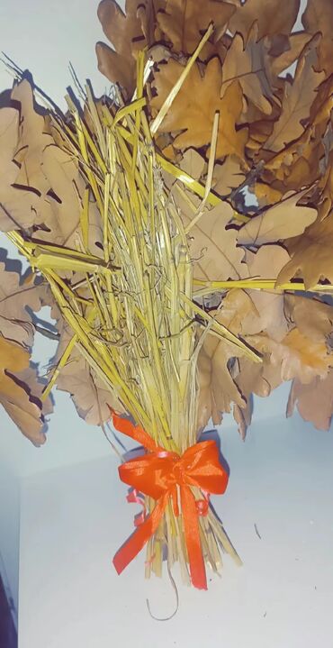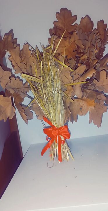 Ručni dekorativni buket od prirodnih materijala - Sastav: suvo hrastovo lišće i stabljike slame oblikovani u buket. - Dekor: crvene kuglice/ukrasi i minijaturna zrna kukuruza raspoređena po granči...