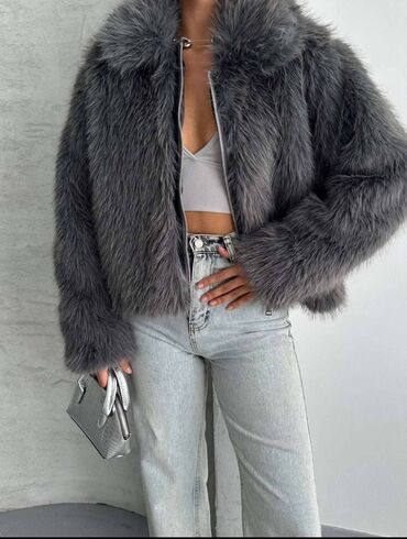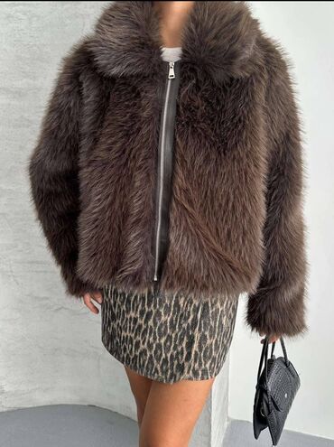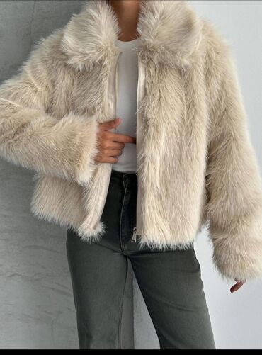 Ženska bunda/kaput od veštačkog krzna u boji krem. Model sa izraženim, širokim reverima i dužinom do ispod kukova. Pojas od imitacije kože u smeđoj boji sa metalnom kopčom naglašava struk; isti kož...