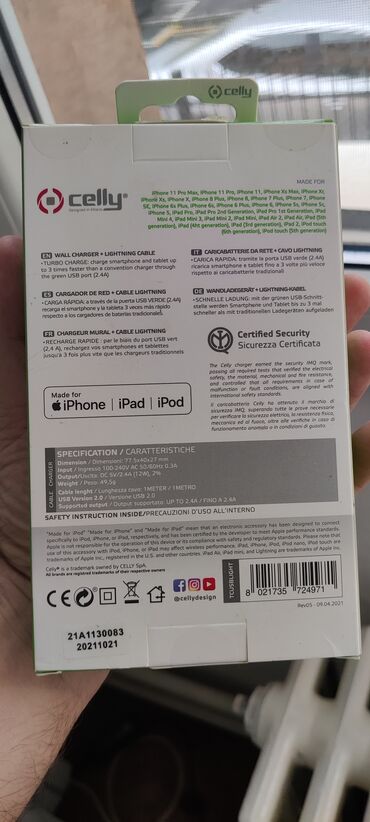 - Kompatibilno sa Apple uređajima: iPhone, iPad, iPod (Made for iPhone | iPad | iPod). Na pakovanju navedeni modeli uključuju iPhone 13, 12,11 seriju, X/XS/XS Max/XR, 8/8 Plus, 7/7 Plus, 6s/6s Plus, SE, 6/6 Plus, 5s/5c/5, kao i brojne iPad i iPod generacije (iPad Pro, Air, mini, iPod touch/nano – vidi listu na poleđini).