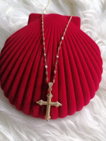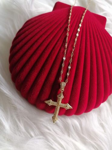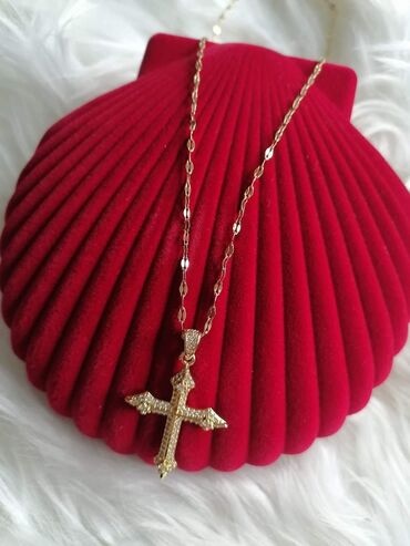 Muški/narukvica i lanac sa priveskom – zlatna boja, krst sa raspećem - Set: lanac sa priveskom krsta - Dizajn: figaro lanac u zlatnoj boji, detaljno izrađen pravoslavni/krst sa raspećem i ornament...