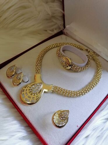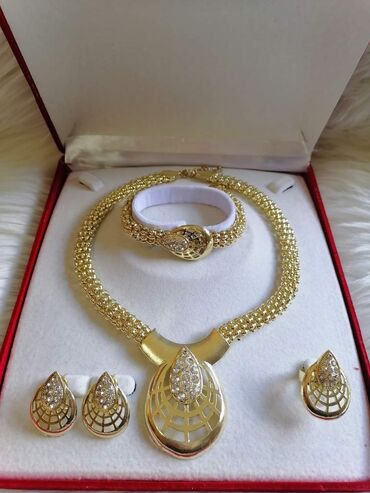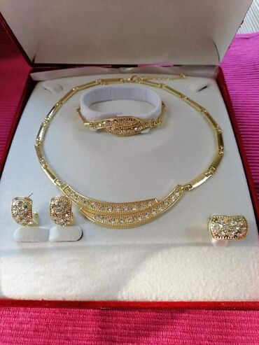 Ženski komplet nakita sa satom – elegantan set za posebne prilike Sastav kompleta: - Ručni kvarcni sat sa okruglim brojčanikom, dekorisan kristalima i metalnom narukvicom u zlatnoj boji sa emajlir...