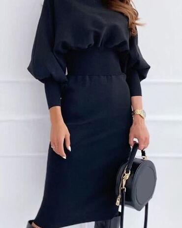 Ženska pletena haljina sa visokim kragnom i dugmićima - Kroj: midi dužina, blago A-linija sa naborima od struka nadole; spuštena ramena i dugi rukavi. - Kragna: visoka (polo/rol), prednji deo sa p...