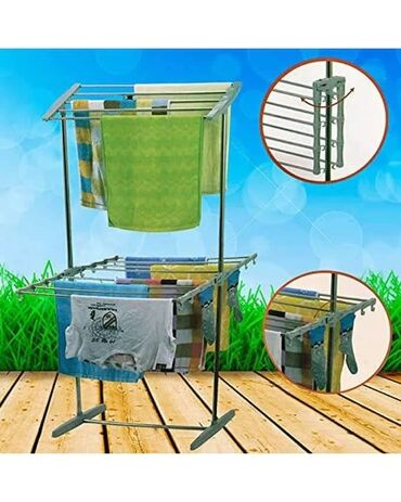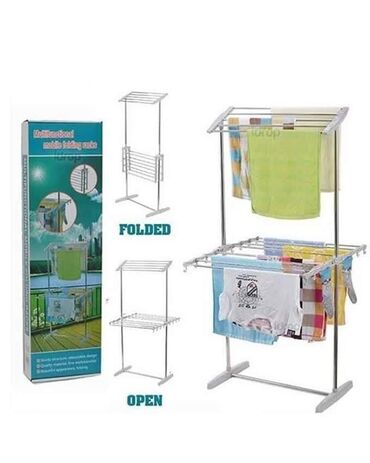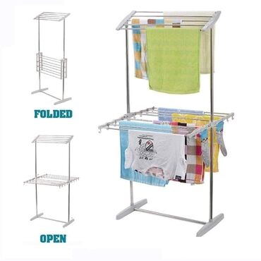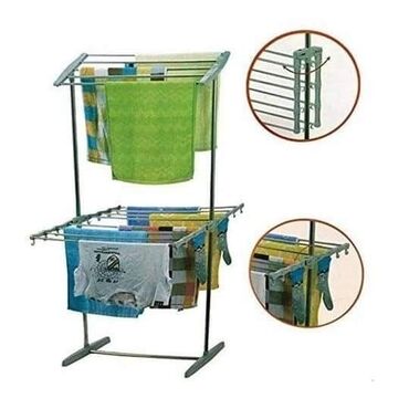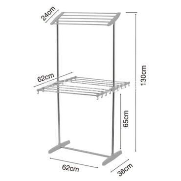 Dupli stalak, na sprat, koji ide u visinu a ne u širinu, ima dovoljno prostora da raširite jednu celu mašinu veša. Dva nivoa, dve površine za sušenje, žice su obložene kvalitenim materijalom, a donji deo stalka je obložen jakom plastikom.