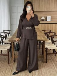 Dvoslojni komplet za žene – rebrasti kardigan i pantalone - Boja: topla taupe/smeđkasta - Materijal: meki, elastični rebrasti plet (udobno i prijatno uz telo) - Gornji deo: uski kardigan sa dugim ...