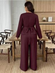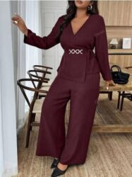 •Dvodelni kompleti za punije •Opis: Elegantni dvodelni kompleti za punije dame, sastavljeni od bluze i pantalona. Bluza ima V-izrez sa diskretnim naborima i duge čipkaste rukave sa manžetnama, dos...
