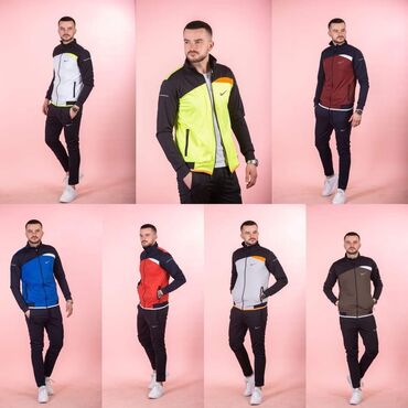 Muški komplet trenerki – dva modela 1) Nike komplet: - Gornji deo na rajsferšlus, visoka kragna - Boje: crna sa plavim ramenima i belim detaljima/linijama - Diskretni Nike Swoosh logotipi na jakni...