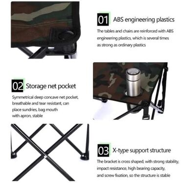 Stol i stolice za kampovanje imaju čelični okvir, što ih čini stabilnima i dugotrajnima. Poliesterska tkanina je otporna na vremenske uslove i vodu, izdržljiva i jednostavna za čišćenje. Stol i stolice za kampiranje su lagani i sklopivi, lako ih je poneti sa sobom na izlete bez zauzimanja puno prostora.