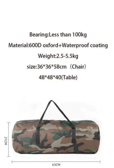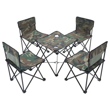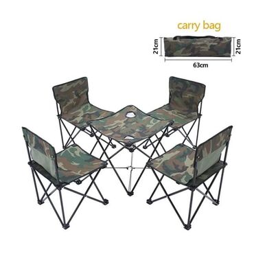 Set uključuje: 1 sklopivi stol, 4 sklopive stolice i 1 torbu za nošenje.