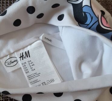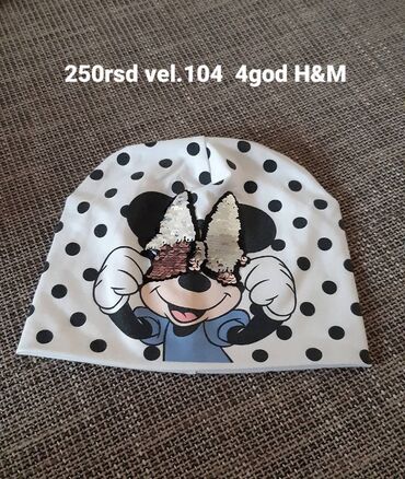Dečija kapa H&M x Disney, sa printom Mikija i crno-belim tufnama. Napred su dvobojne šljokice koje menjaju izgled potezom ruke. Veličina: EUR 104 (US 3–4Y / CA 3–4A / CN 51 / MX 104) – odgovara uzrastu oko 4 godine. Materijal: pamučna mešavina, meka i prijatna za nošenje. Na unutrašnjoj strani postoji etiketa za upis imena. Proizvedeno u Turskoj. Cena: 250 RSD (kako je naznačeno na fotografiji).