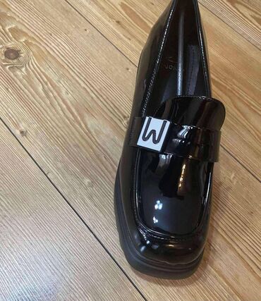 Ženske mokasine sa debljom petom – lak crna - Materijal: visoki sjaj (lak) sintetička koža - Boja: crna - Model: mokasine sa remenom preko risa i dekorativnom metalnom pločicom sa slovom “W” - Đon...