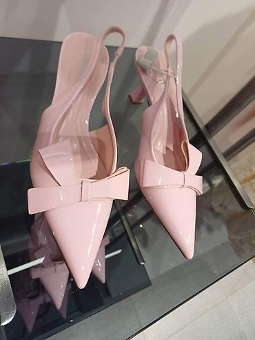 Elegantne bele cipele sa niskom blok potpeticom i kaišem oko članka. Špicast vrh, gornjište ukrašeno naborenom satenskom mašnicom i diskretnim redom sitnih svetlucavih kamenčića duž ivice. Otvorena...