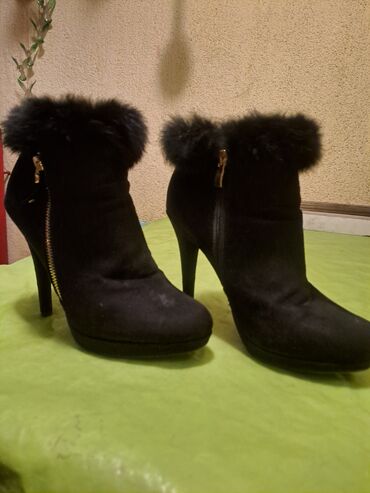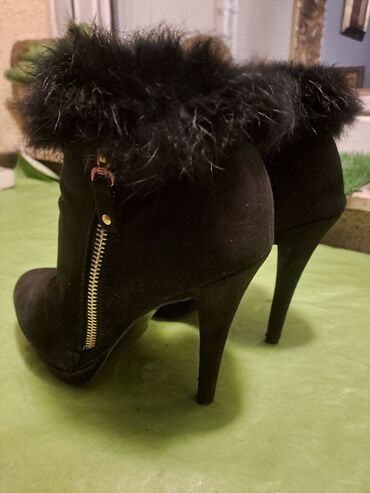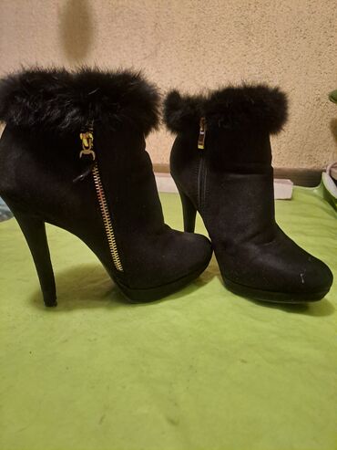 Cizme kratke crne od prevrnute koze sa platformom i zlatnim rajfeslusom, br. 40. Vrlo elegantne, moderne, kao nove! Visina stikle 12cm, smanjene za platformu od 2cm. Skupocene