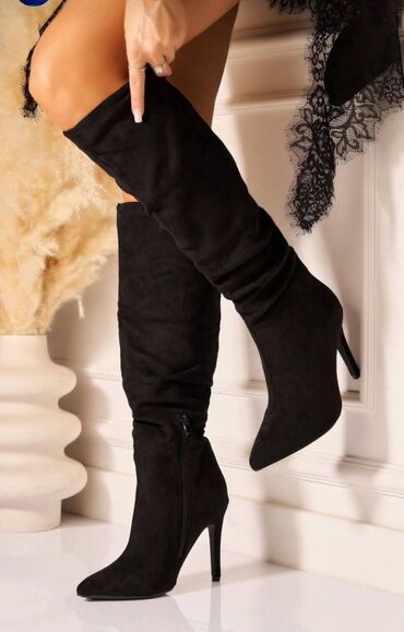Crne lakovane čizme do kolena sa tankom potpeticom. - Materijal: sjajna lak koža/eko-koža visokog sjaja. - Visina: do kolena, ravne i glatke osovine sa blago naboranim efektom pri zglobu. - D...