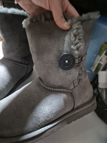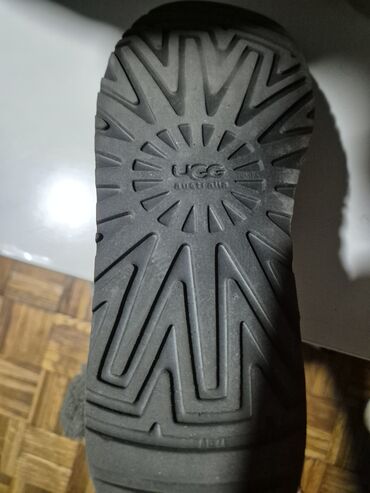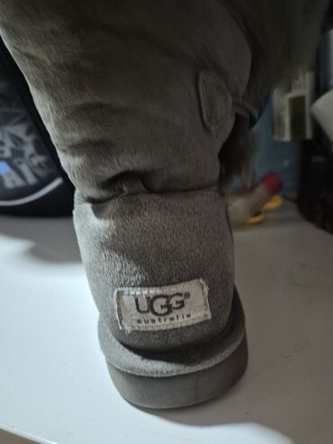 Ženske zimske čizme UGG, kratki model. - Materijal: spolja prirodna brušena koža (antilop), iznutra mekana topla vuna/krzno. - Boja: topli taupe/smeđesiva ton. - Visina do gležnja, klasičan „short...