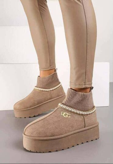 Ženske zimske čizme sa unutrašnjom postavom od veštačkog krzna, u braon boji. Gornjište je od mekane brušene kože (ili materijala sličnog veluru), sa dekorativnim šavovima i kožnim trakama sa drike...