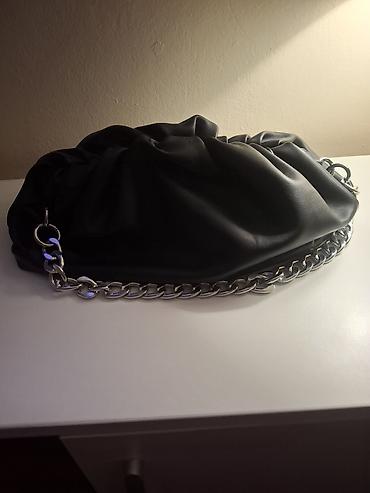 Napomena: Fotografije verno prikazuju izgled – crna mekana torba sa srebrnim lancem i naborima na vrhu.