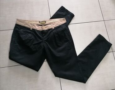 Ženske pantalone i farmerke – više modela i mere u slikama. 1) Tamnoplave pantalone na dugmad - Materijal: 97% pamuk, 3% elastin - Veličina: M - Dužina: 96 cm - Poluobim struka: 37–42 cm (elastiča...800 RSD