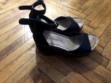 Ženske sandale na platformu - Veličina: 39 (oznaka na đonu) - Gornji deo: kombinacija crne trake i trake u printu imitacije zmijske kože - Kopčanje: dve metalne kopče sa bočne strane za podešavanj...