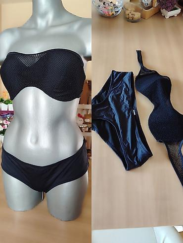 Crni dvodelni kupaći kostim – klasičan model - Boja: jednobojna crna - Gornji deo: balkonet/bando stil sa naborima na sredini, formirane korpe; vezivanje oko vrata; kopča sa strane za sigurno prič...