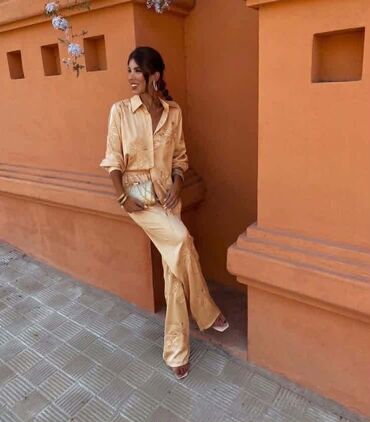 Elegantna ženska kombinacija za posao i svečane prilike. - Satenska košulja dugih rukava sa klasičnim kragnom i dugmadima sprijeda. Ležerniji, blago oversize kroj sa spuštenim ramenima i dugim man...