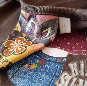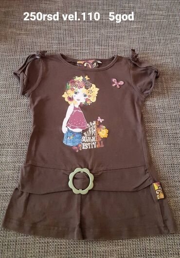 Kratak rukavDečja haljinica/duža majica kratkih rukava, braon boje, sa printom devojčice, leptira i šarenih cvetnih detalja u hippie stilu. Napred ukrasni „pojas” sa plastičnom kopčom u obliku cveta. Okrugli izrez, blago naboreni rukavi sa vezivanjem. Materijal mek i rastegljiv (pamuk/elastin tip). Veličina: 110 (oko 5 godina). Na etiketi i print detaljima prisutni višebojni motivi.