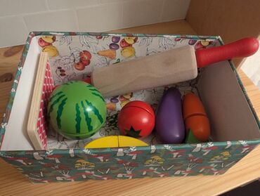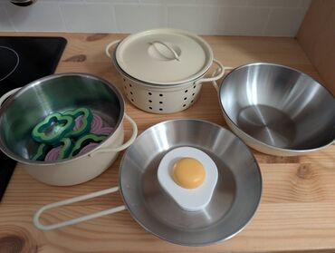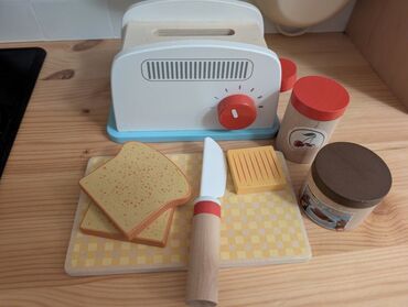 - U kompletu se vide: set plastičnih čaša u više boja na poslužavniku, metalni i drveni viseći pribor (kutlača, penja, cediljka, tiganj), šerpa sa poklopcem, kao i drveni set za doručak: toster sa tasterom/točkićem, daska za sečenje, nož, dve kriške tosta, “sir”, i teglice (kafa/kakao, začini)