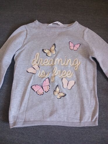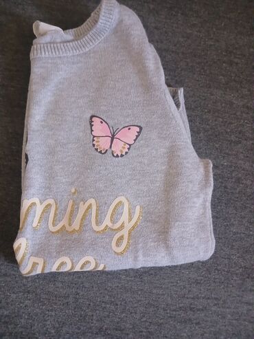 Dukserica za devojčice u sivoj boji sa dugim rukavima i okruglim izrezom. Prednju stranu krasi štampani motiv "dreaming is free" u zlatnoj boji, okružen leptirima različitih veličina i roze nijansi, dodajući joj razigran i maštovit izgled. Rukavi i donji deo dukserice su završeni rebrastim ranflama, što obezbeđuje udobno prianjanje i zadržavanje toplote. Izrađena je od mekog materijala, pogodna za svakodnevno nošenje i kombinovanje sa različitim odevnim predmetima.Lako se održava i idealna je za igru i slobodne aktivnosti.