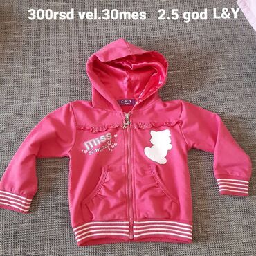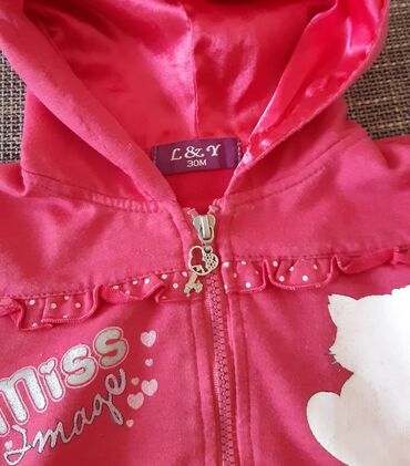 Dečija dukserica sa kapuljačom L&Y, veličina 30 meseci (oko 2,5 godine). Boja: jarko roze. Model na rajsferšlus sa ukrasnim priveskom u obliku srca i ključa. Napred dva urezana džepa. Dekorativni volan sa tufnicama preko grudi, natpis “Miss image” sa sitnim srcima i bela silueta mace. Rukavi i donji rub sa prugastim rebrastim ranflama. Materijal mekan i prijatan, postavljena kapuljača sjajnim satenskim izgledom. Na slici je naznačena cena: 300 rsd. Marka: L&Y.