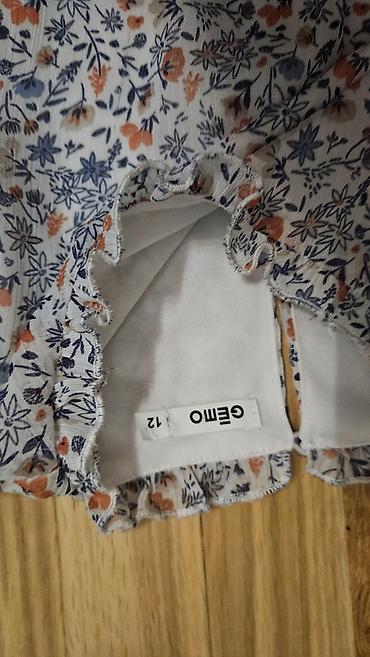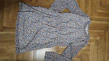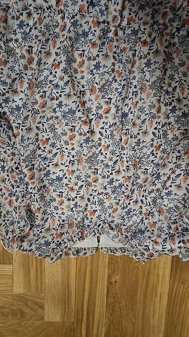- Dizajn: cvetni dezen na beloj podlozi – plavi, bež i narandžasti tonovi; volančići/ćoškovi na završecima rukava i donjoj ivici.