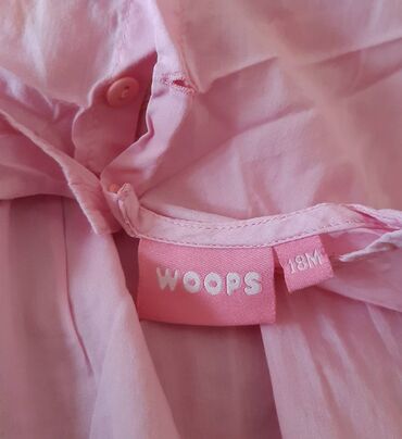 Dečija haljina Woops, bez rukava, roze boje. Model sa više volana (slojevita suknja) i ukrasnim vezenim detaljima cveća na grudima u žuto‑roze tonovima. Kopčanje pozadi na dugme. Na etiketi označeno 18M; u tekstu fotografije naznačeno: vel. 86. Lagana, prijatna za tople dane.